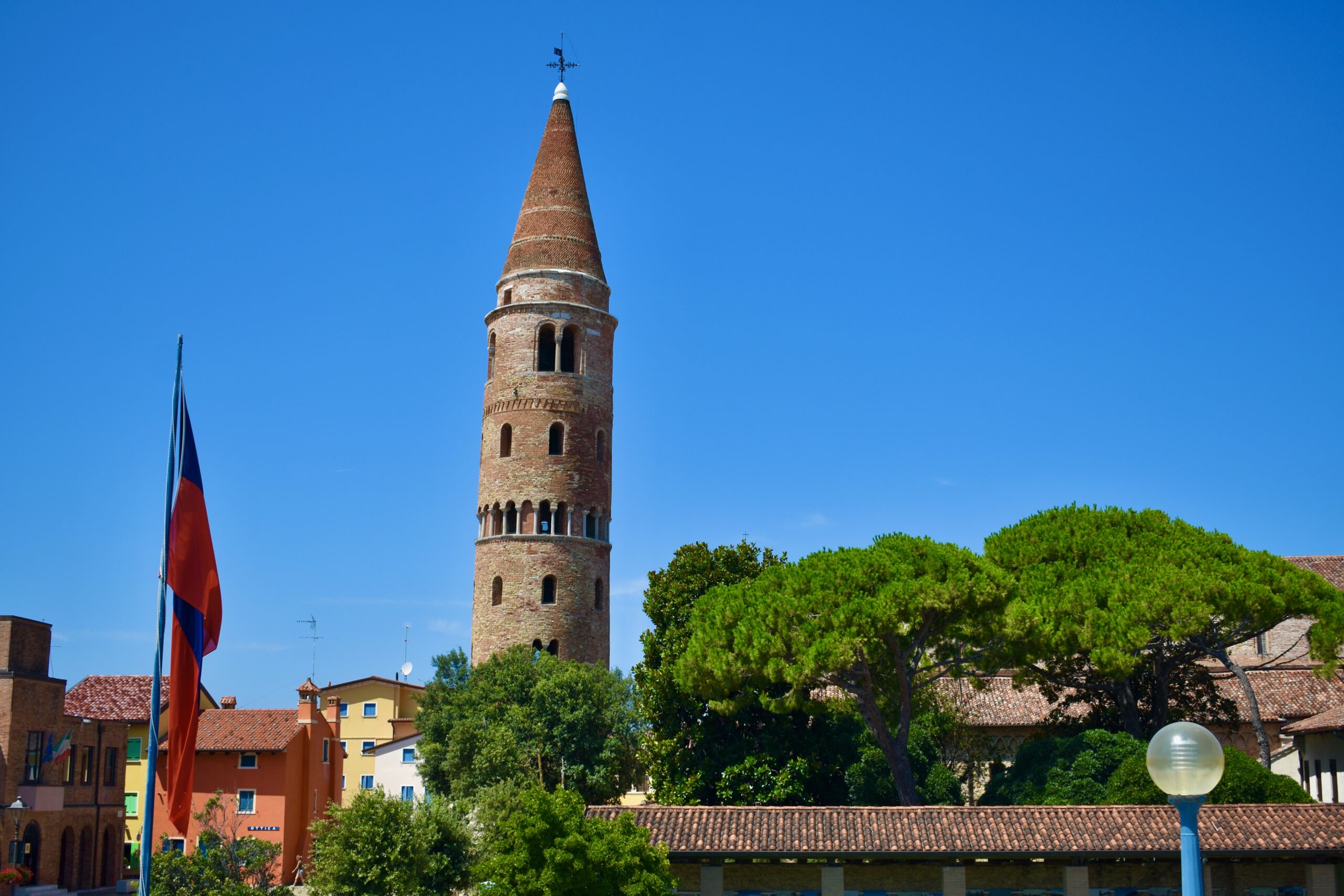 Accanto al Duomo si erge il Campanile, una torre alta circa 48 metri, che rappresenta uno dei simboli più riconoscibili di Caorle. Costruito in stile romanico-gotico nel XII secolo e successivamente rimaneggiato in epoche successive, il campanile offre una vista panoramica mozzafiato sulla città e sulla laguna circostante. La sua struttura imponente e la sua posizione privilegiata lo rendono un punto di riferimento importante per i visitatori che esplorano il centro storico di Caorle e la sua particolarità che è leggermente inclinato.